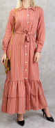 Robe longue, col rond, manches droites décorées de boutons, taille ajustable avec lien de serrage. Coupe droite, tissu léger mi saison, effet tissé.