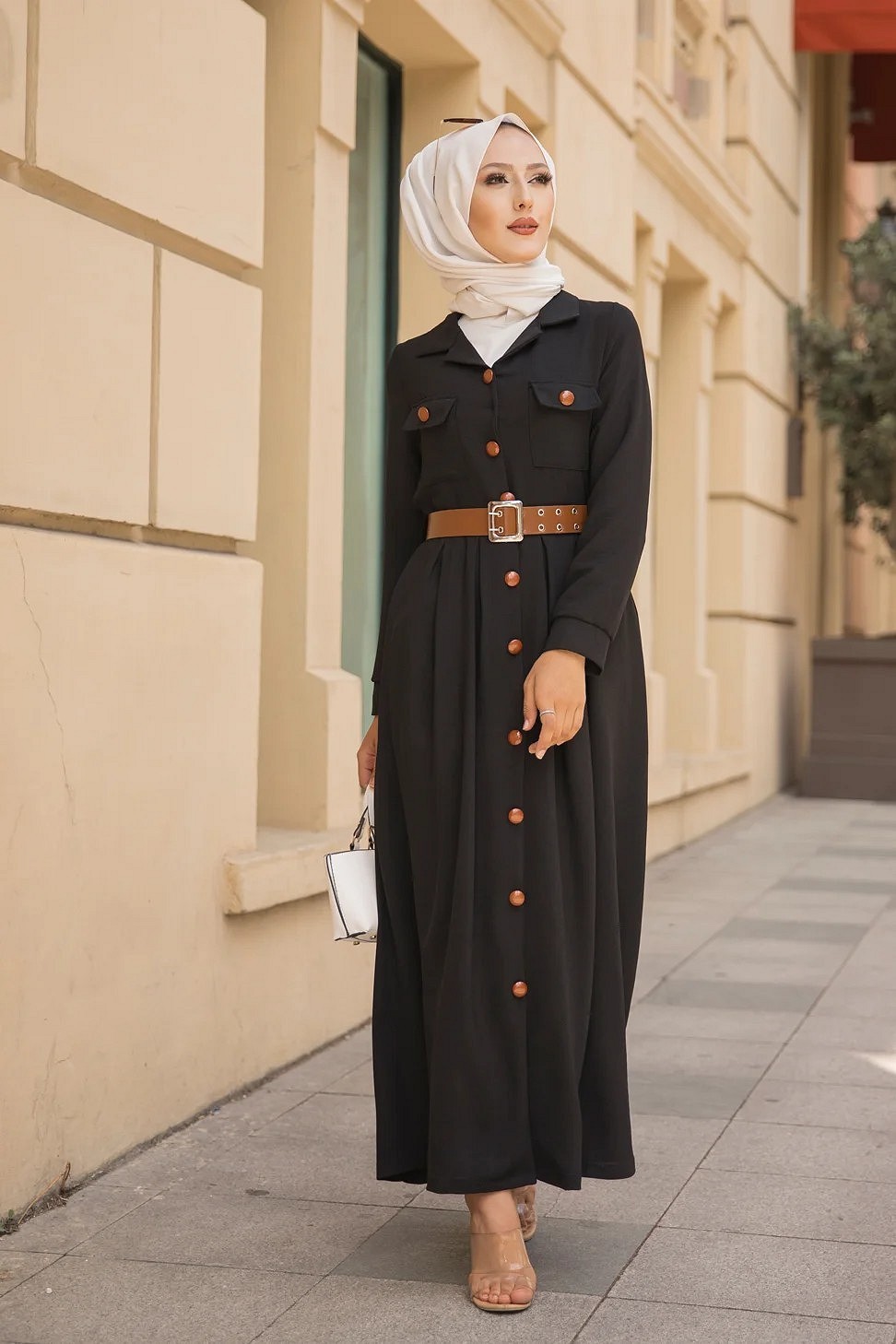 Robe longue casual boutonnee avec sa ceinture (Vetement hijab chic pour femme) - Couleur Noir