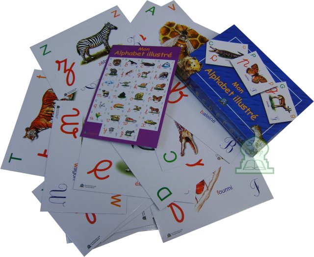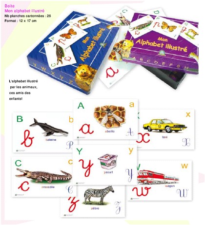 Mon alphabet illustré. Boite avec des cartes en couleur contenant l'alphabet français avec les différentes écritures possibles de chaque lettre, avec une image commençant ou contenant la lettre concernée.