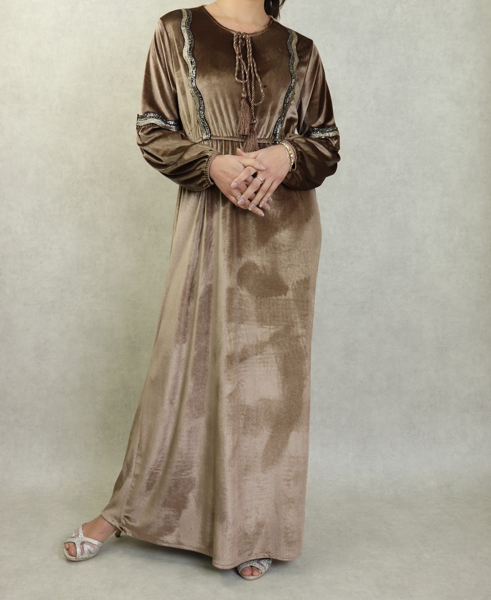 Robe orientale en velours avec broderies et paillettes pour femme - Couleur Brun Vetement & Accessoire