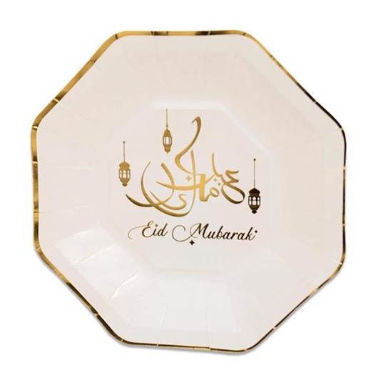 Assiette Eid Mubarak : Lot de 8 assiettes pour fête musulmane de l'Aïd - Couleur blanc doré - REF. 35059 (3.50 €)
