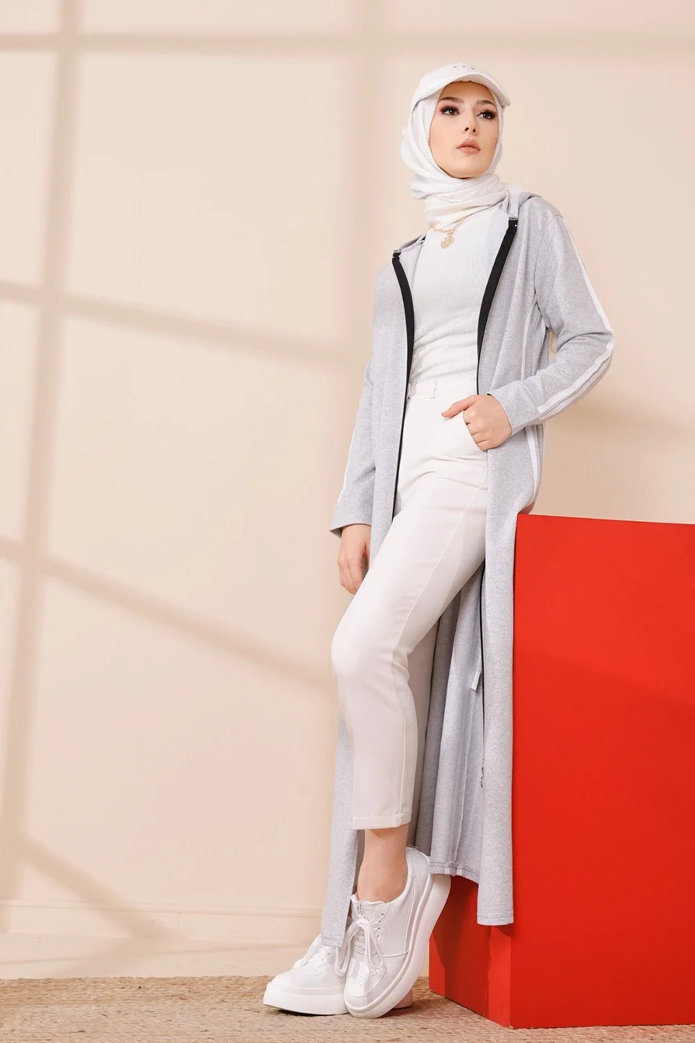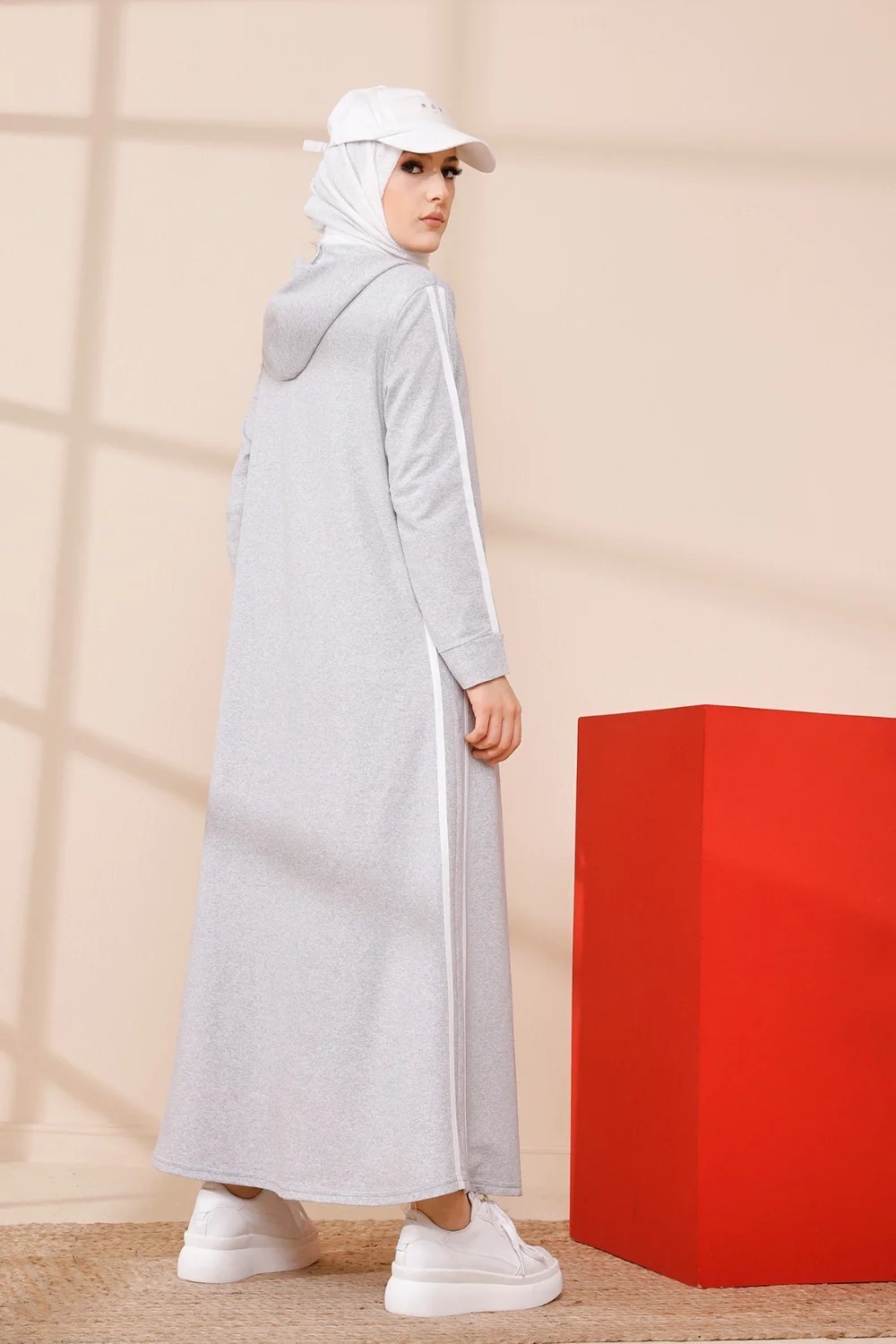 Cardigan long à capuche - Robe zippée style sport pour femme musulmane - Couleur Gris clair - REF. 32509 (25.00 €) - En Promotion à 19.90 €