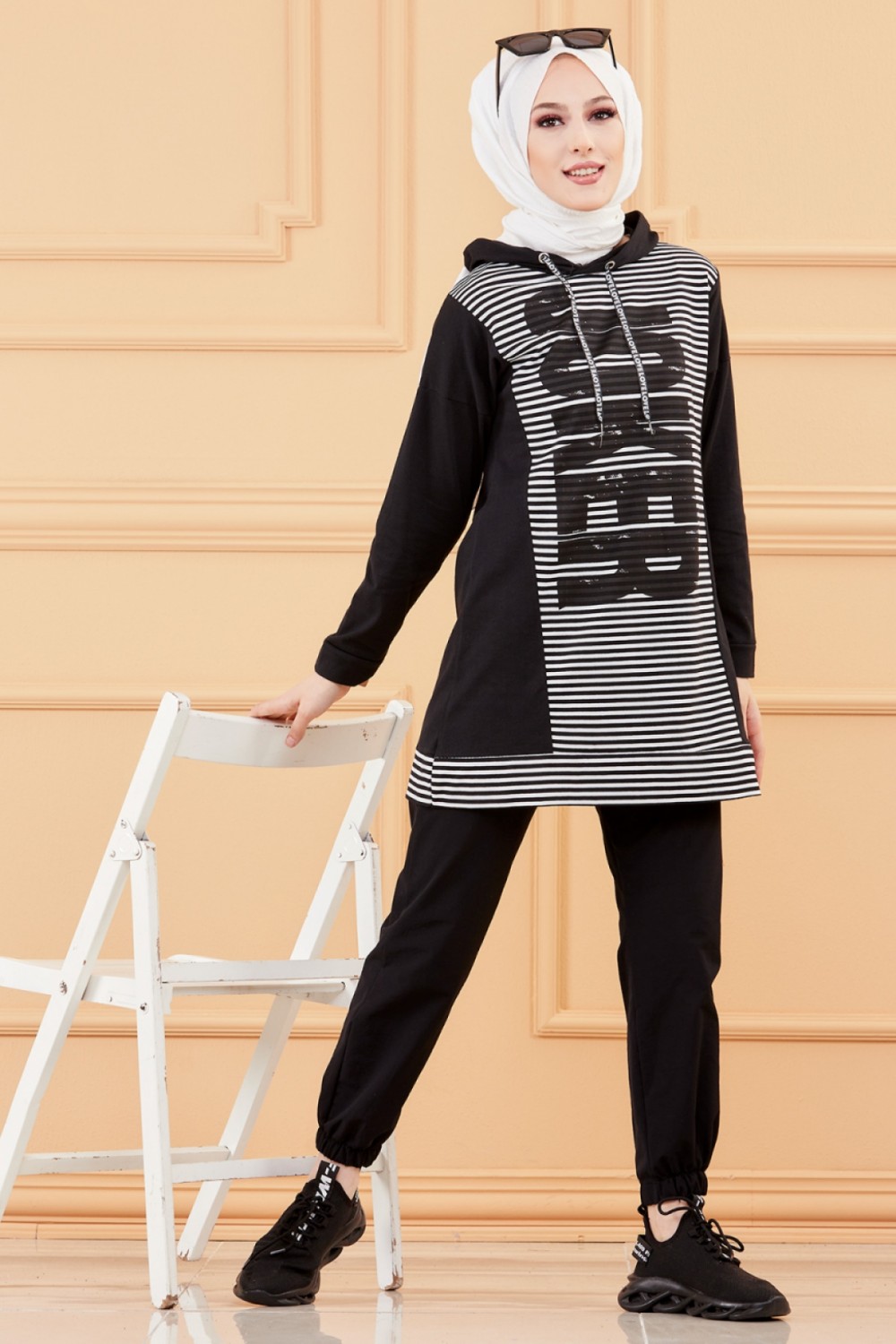Robe décontractée à capuche style sportswear - Tenue Hijab moderne pour femme musulmane - Couleur noir blanc et nude - REF. 32925 (29.90 €)