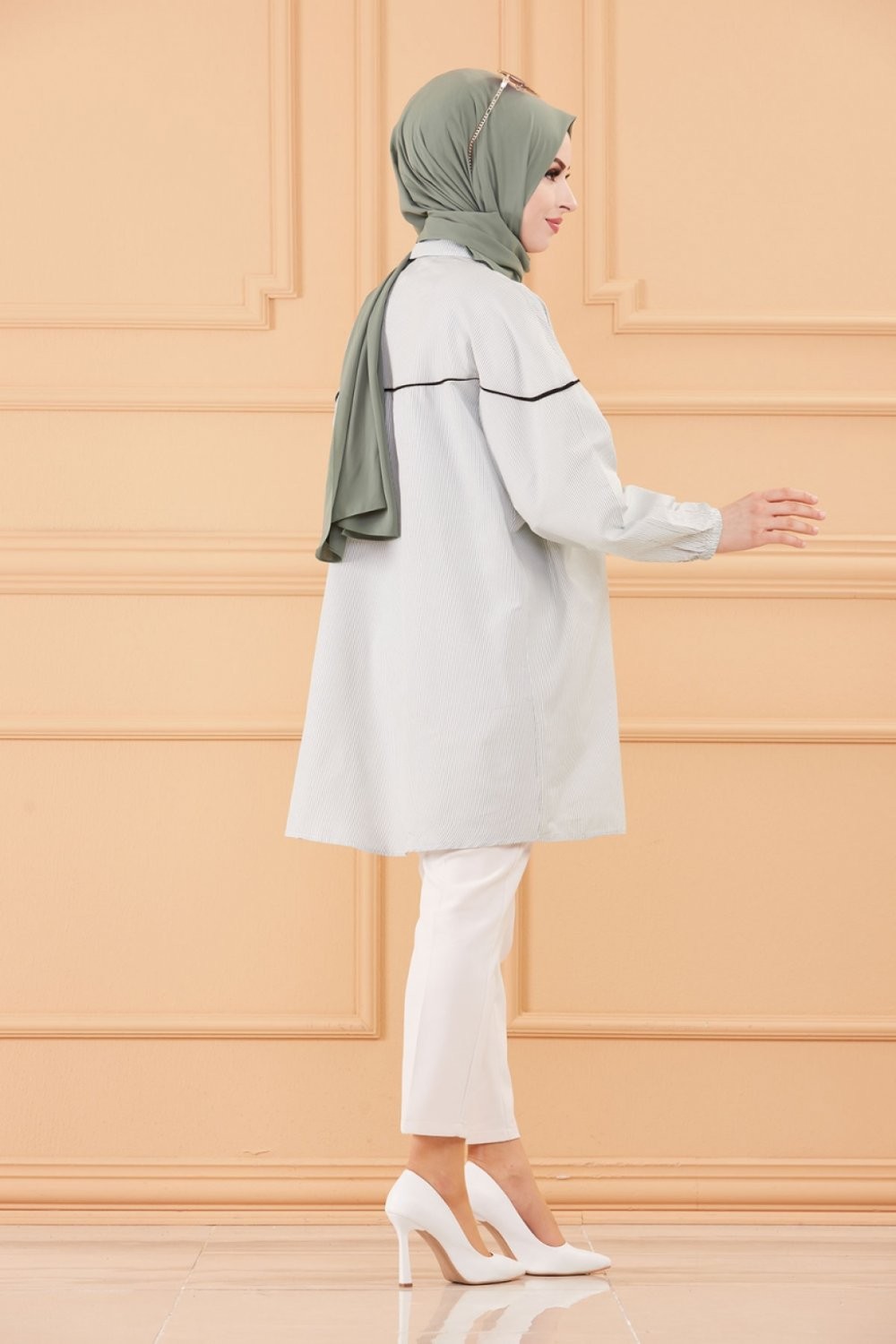 Tunique-Chemise habillee ample avec bande et boutons noirs (Boutique Vetement Hijab chic en ligne) - Rayures de couleur menthe