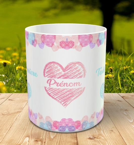 Mug cadeau cur - Tasse avec message et prenom personnalise multicolore rose, bleu et saumon (pour fille)