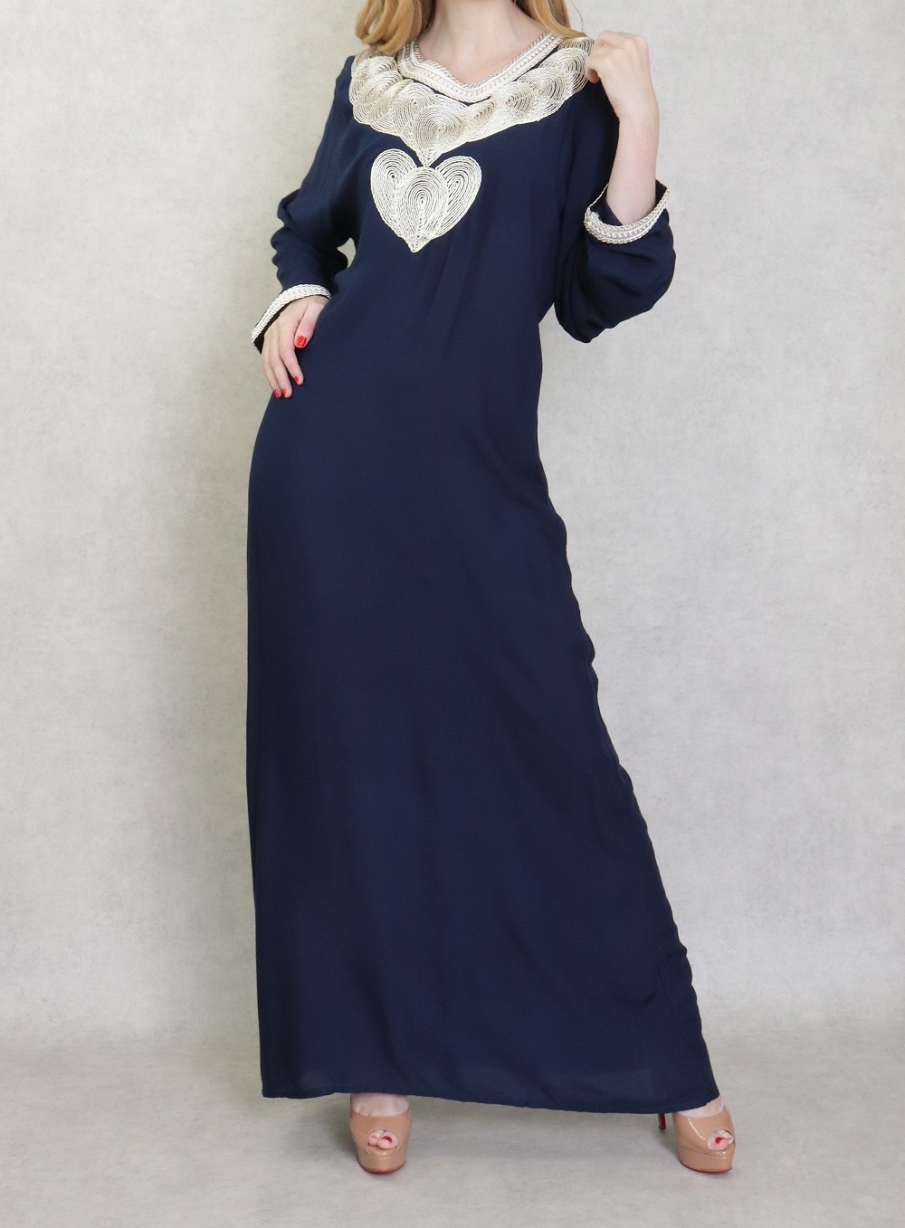 Robe longue style oriental avec borderie originale sous forme de coeur pour femme - Couleur Bleu nuit Vetement & Accessoire