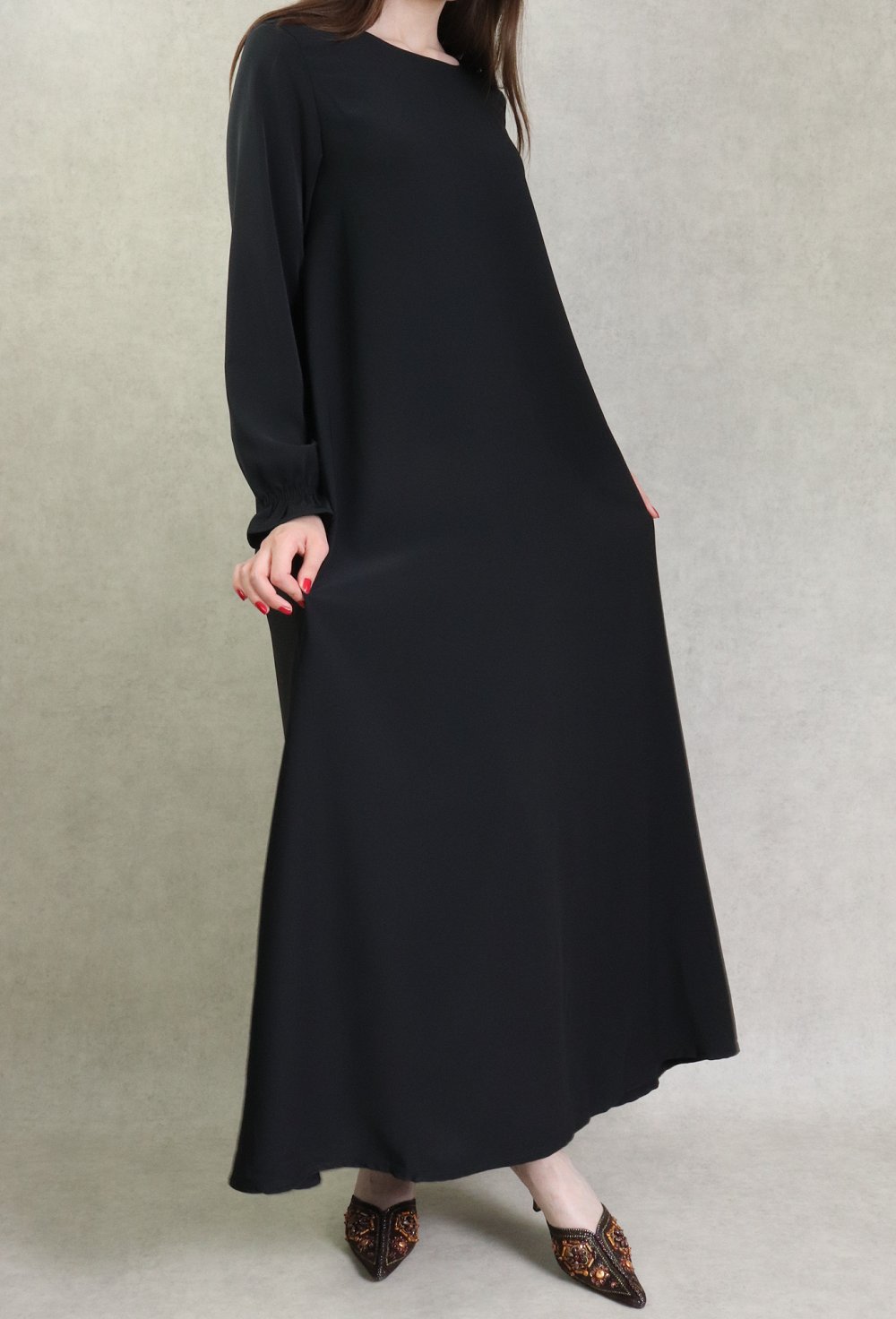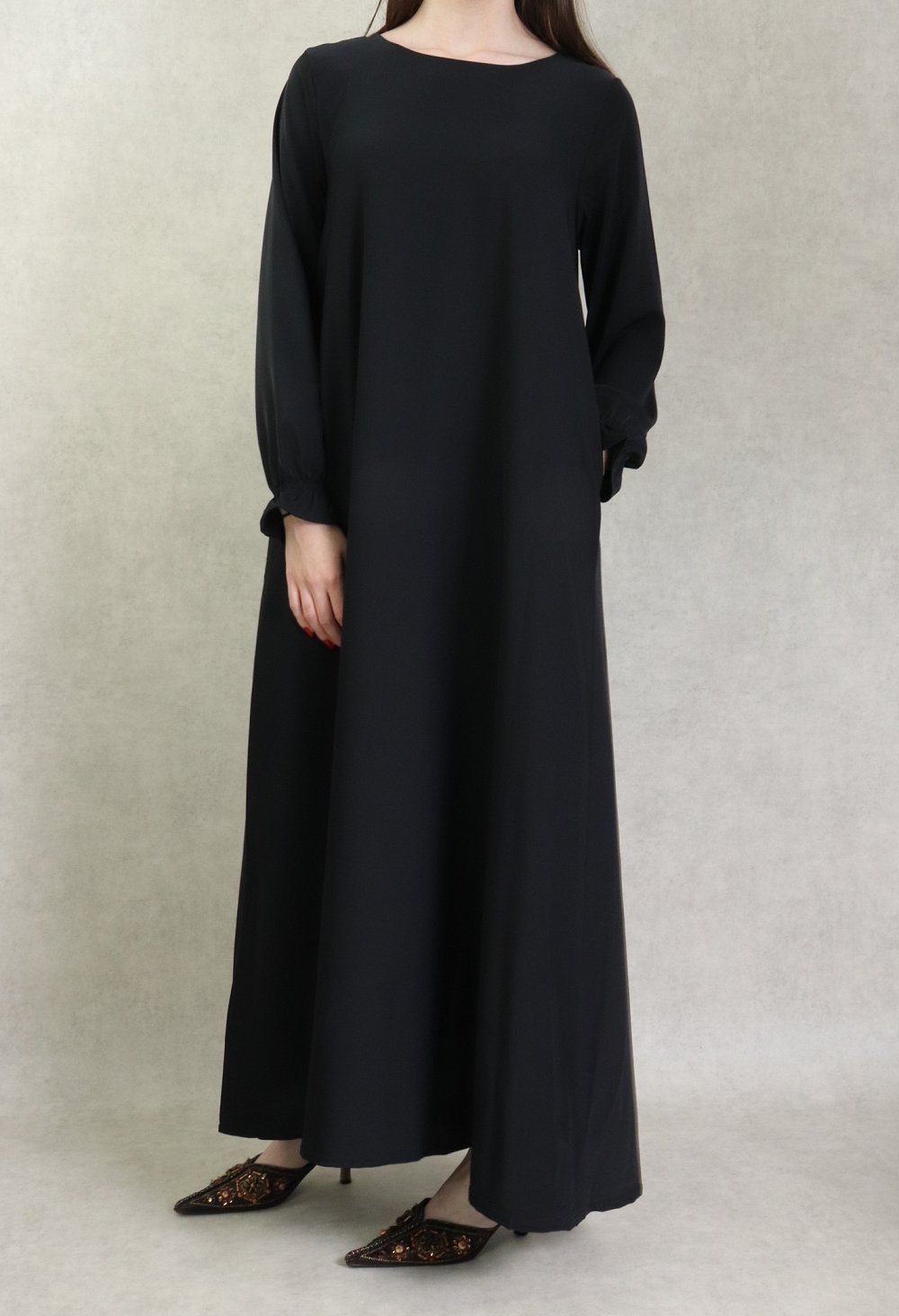 Jolie robe Abaya longue, col rond, coupe évasée, deux poches latérales, tissu nidah noir opaque. Beau tombé et très agréable à porter. Intemporel, il se porte en toutes saisons, en toutes occasions.