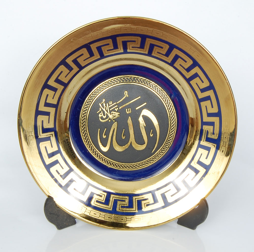 Assiette decorative en porcelaine avec la calligraphie "Allah" decoree de jolis motifs dores - Couleur bleu