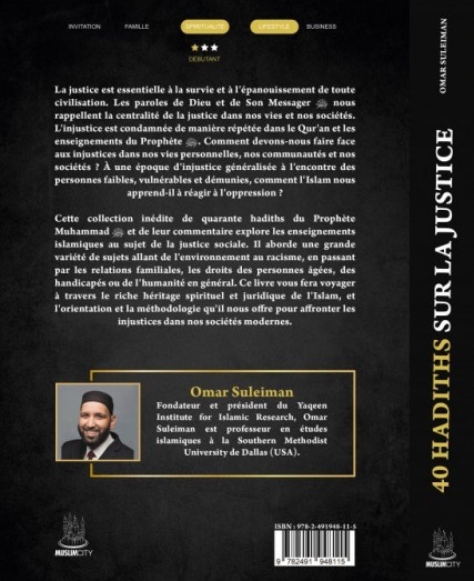 Cette collection inédite de quarante hadiths du Prophète Muhammad (paix et salut sur lui),commentés, explore les enseignements islamiques relatifs à la justice sociale. Il aborde une grande variété de sujets allant de l’environnement au racisme, en passant par les relations familiales, les droits des personnes âgées, des handicapés ou de l’humanité en général. Ce livre nous fait découvrir le riche héritage spirituel et juridique de l’Islam tout en nous donnant l’orientation et la méthodologie pour affronter les injustices dans nos sociétés modernes.
