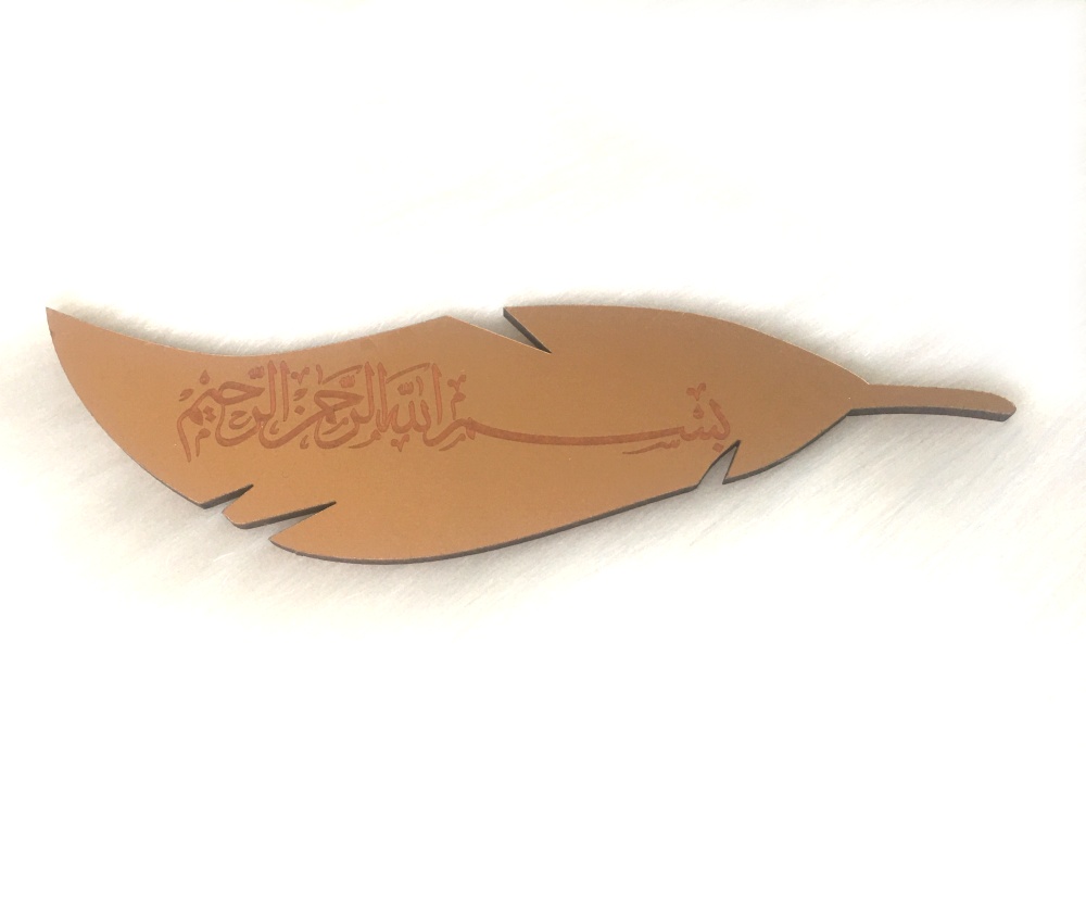 Marque-page solide sous forme de feuille dorée avec inscription de la Basmala (Bismillâhi Rahmâni-Rahîm). Effet miroir sur les deux faces, Son épaisseur est d'environ 2 mm.