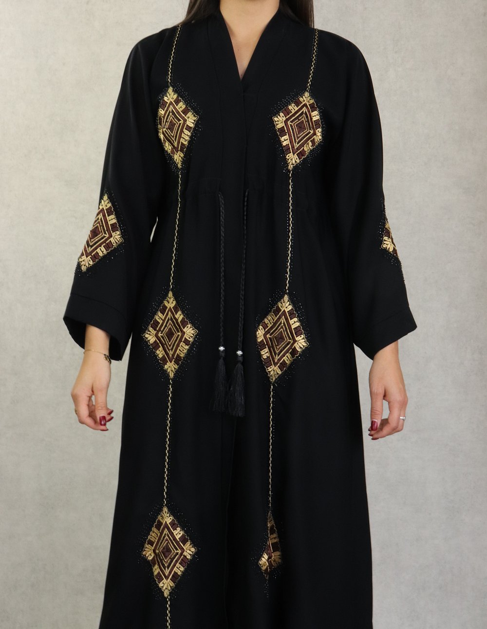 Robe Abaya Dubaï noire de qualité avec broderie et strass dorés et ceinture interne - REF. 38193 (39.90 €)