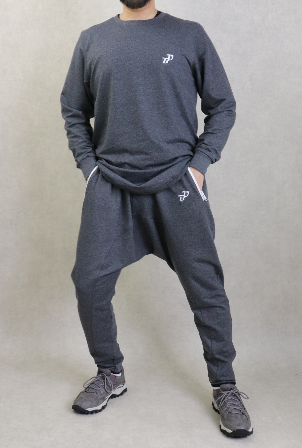 Esemble deux pièces constiuté d'un sweat longline et d'un sarouel large et long couleur gris foncé chiné. Deux poches zippées latérales et une poche arrière zippée de couleur blanche. Tissu jogging léger type coton stretch. Bande noire au niveau des chevilles. Braguette zippée. Brodé logo BU (Best Ummah).