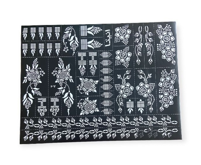 Une très grande plaque de motifs de tatouages au henné est idéale pour réaliser vos tatouages lors de mariages et fêtes. Ces plaques offrent une variété de motifs, souvent floraux et élégants, qui permettent de créer des tatouages temporaires réussis et sans bavures.