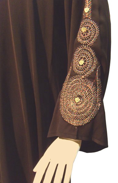Robe orientale noire (Abaya) avec broderies dorées sur le devant, le bas, le dos et les manches. Se ferme au centre avec des boutons pressions.