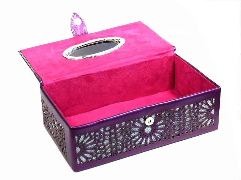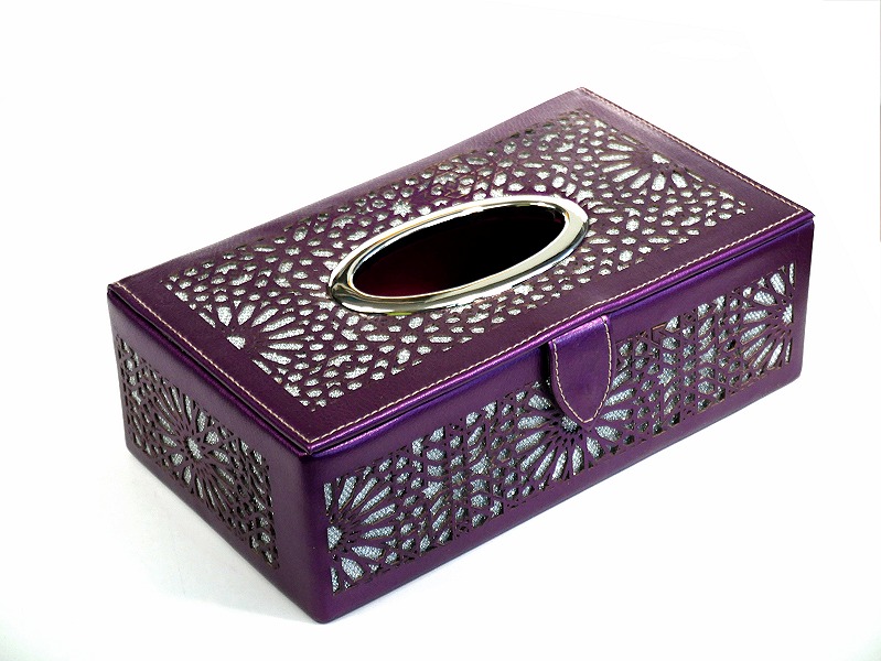Boite a mouchoirs decorative en cuir de fabrication artisanale marocaine de couleur mauve