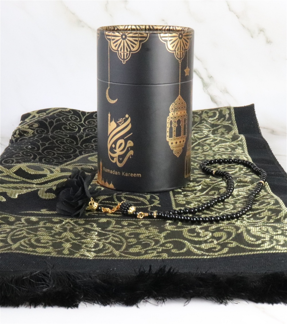 Jolie boite cadeau ronde dorée contenant un tapis brodé noir (taille adulte) et un chapelet assorti de luxe à 99 perles, avec décorations métalliques.