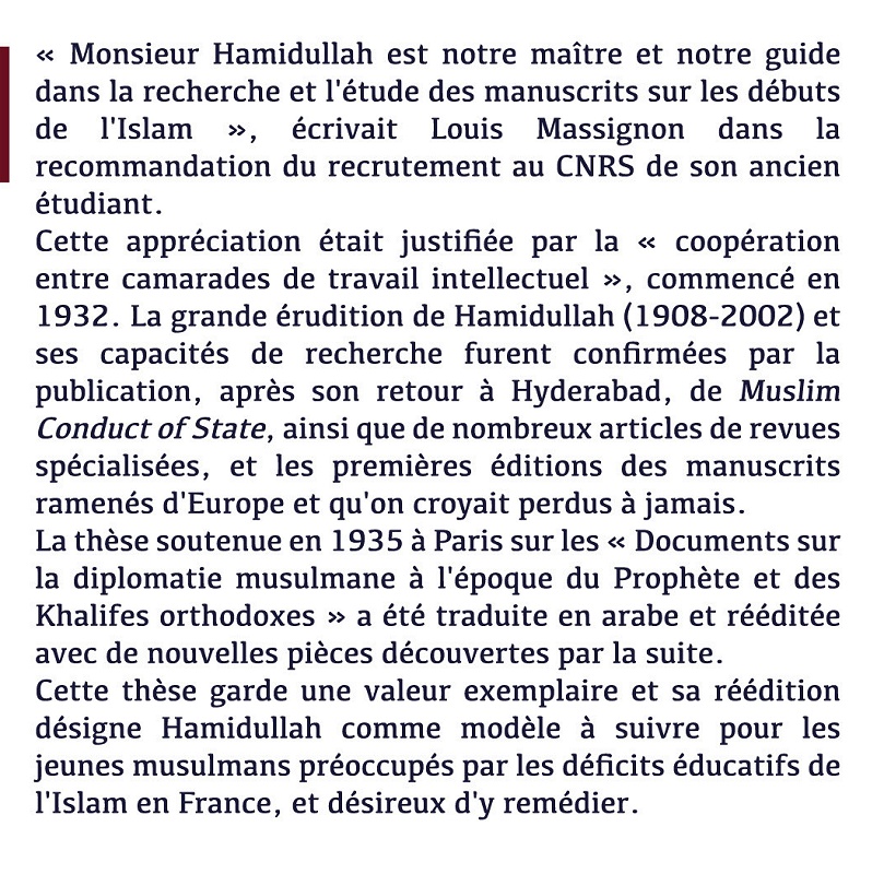 « Monsieur Hamidullah est notre maître et notre guide dans la recherche et l'étude des manuscrits sur les débuts de l'Islam », écrivait Louis Massignon dans la recommandation du recrutement au CNRS de son ancien étudiant.