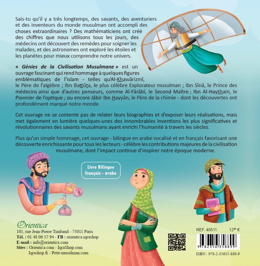 « Génies de la Civilisation Musulmane » est un ouvrage fascinant qui rend hommage à quelques figures emblématiques de l’islam - telles qu’Al-Khawârizmî, le Père de l’algèbre ; Ibn Battûta, le plus célèbre Explorateur musulman ; Ibn Sînâ, le Prince des médecins ainsi que d’autres penseurs, comme Al-Fârâbî, le Second Maître ; Ibn Al-Haytham, le Pionnier de l’optique ; ou encore Jâbir Ibn Hayyân, le Père de la chimie - dont les découvertes ont profondément marqué notre monde.