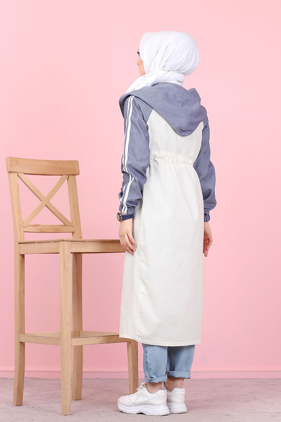 Gilet long bicolore, capuche ample, lien de serrage à la taille. Tissu effet tissé aspect lin.