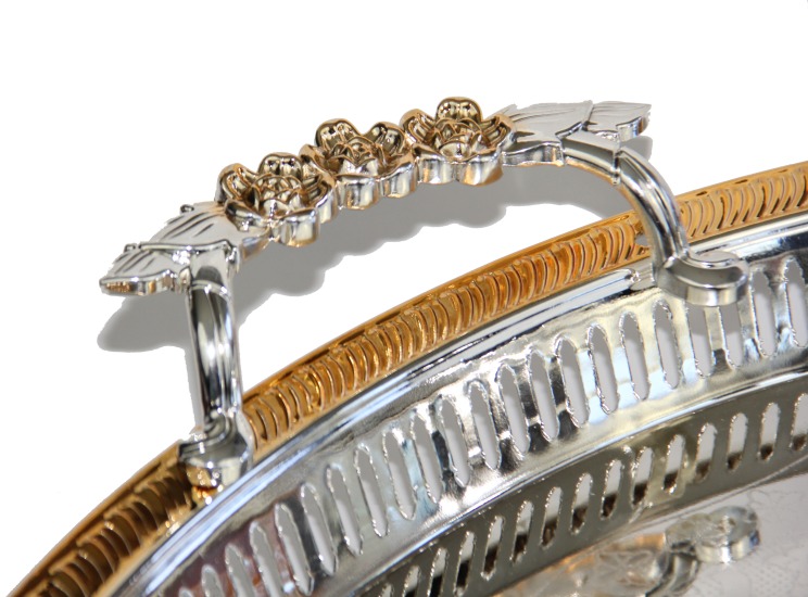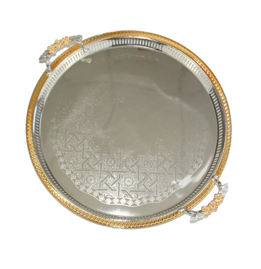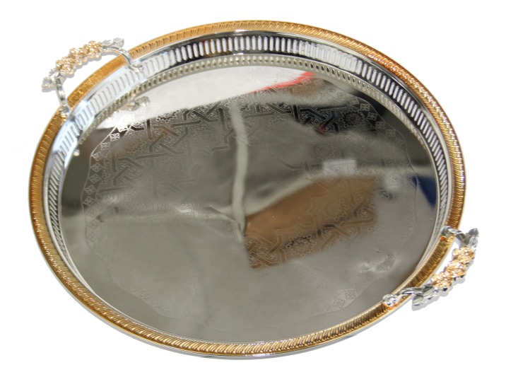 Grand plateau rond inox argenté décoré avec décorations dorées sur les côtés.