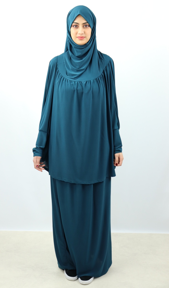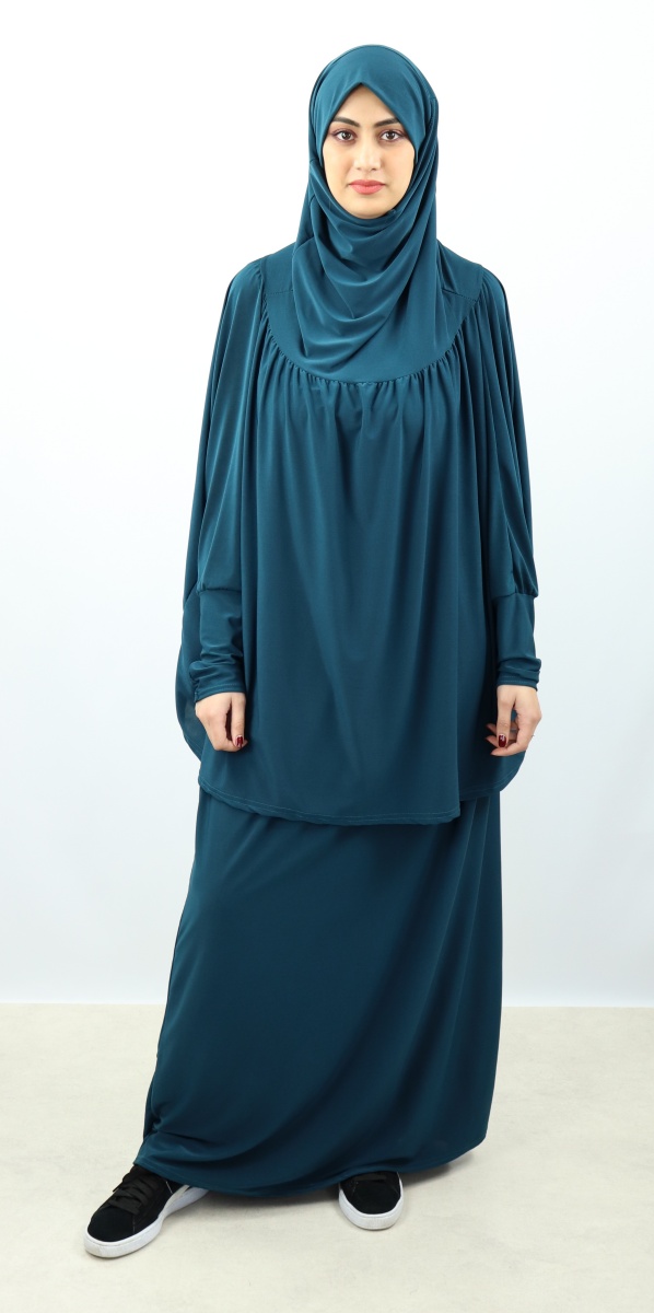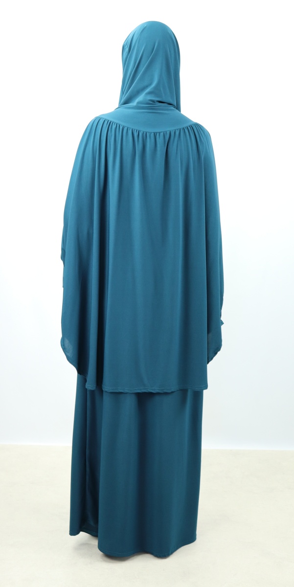 Jilbab deux pièces (cape avec bandeau intégré + jupe) de taille standard large avec tissu extensible passe partout. S'enfile rapidement, tissu fluide. Ce jilbeb est idéal pour faire du sport...