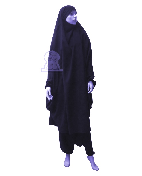 Ce Jilbab deux pièces est composé d’un demi-jilbab cache menton avec bandeau intégré et d’un sarouel (pantalon).