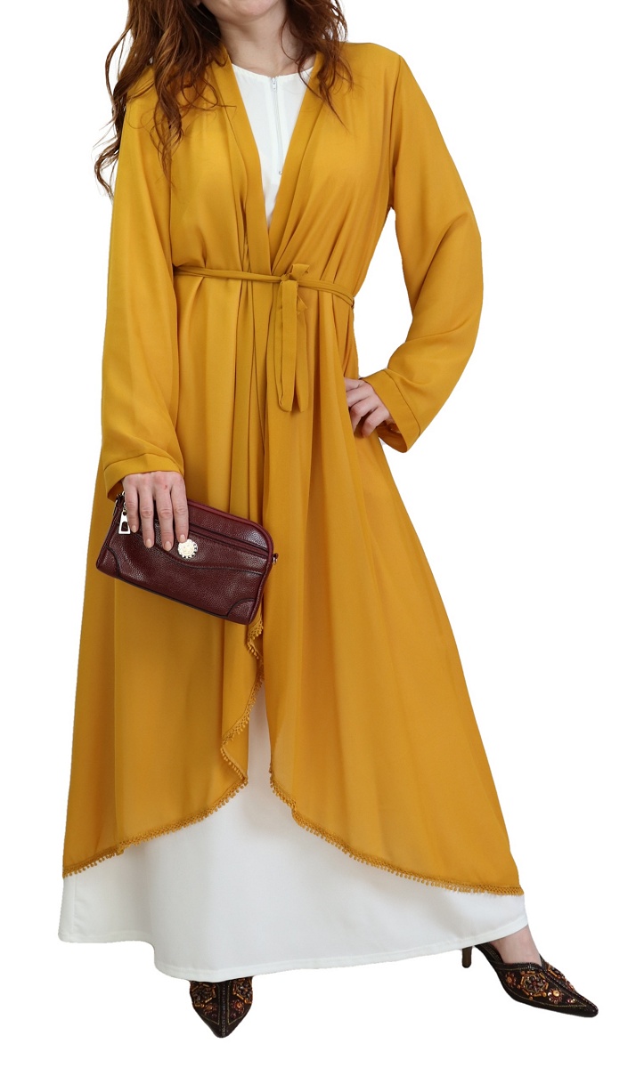 Kimono mi long devant et long derrière, ceinture assortie à passant pouvant se nouer à l'avant comme à l'arrière, broderies sur tout l'ourlet du bas, tissu léger et transparent. Il fait partie des indémodables et complète facilement vos tenues.