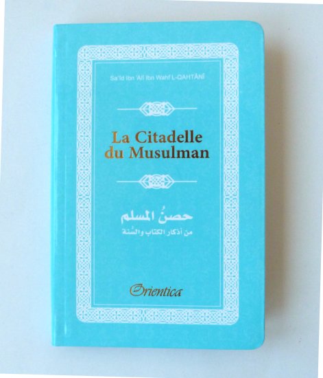 La Citadelle du Musulman par cheikh Al-Qahtani. Ce livre désormais célèbre est un classement des plus importantes invocations prophétiques. Couverture flexible de couleur bleu ciel.