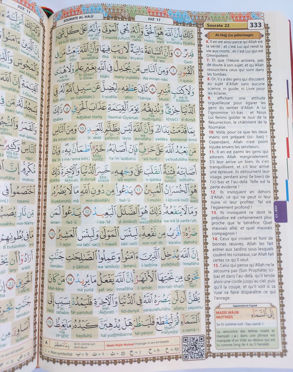 Les règles de tajwid sont données par un système de couleur intuitif pour apprendre les règles de lecture et de psalmodie du Saint Coran et le code QR (présent sur chaque page) permet d'ouvrir une vidéo sur son smartphone et d'écouter et suivre la lecture du Coran par cheikh Soudays.
