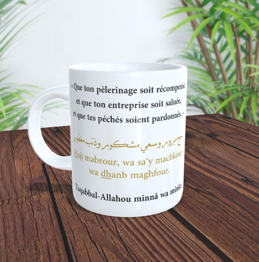 Mug contenant l'invocation (du'a) en arabe qu'il faut dire au pèlerin (hajj ou hajja) à l'occasion du retour du pèlerinage :
