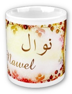Mug avec le prénom Nawel calligraphié en arabe (نوال) ainsi que son épellation lettre par lettre en arabe.