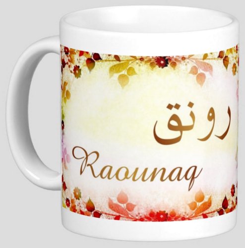 Mug avec le prénom "Raounaq" écrit en français, en arabe (رونق) et calligraphié de façon artistique en arabe sur la partie droite.