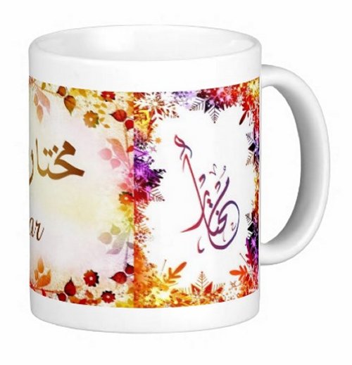 Mug avec le prénom "Mokhtar" écrit en français, en arabe (مختار) et calligraphié de façon artistique en arabe sur la partie droite.