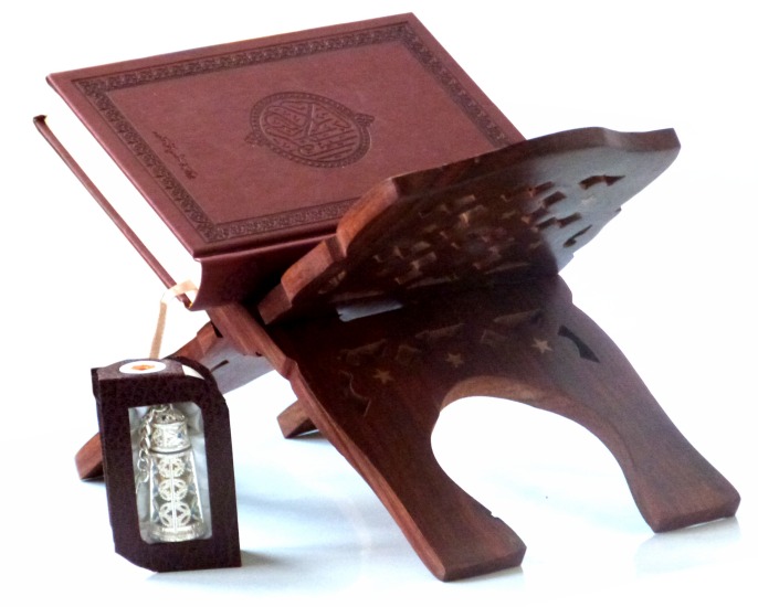 Pack Cadeau constitué d'un Coran arabe couverture similicuir de luxe (mauve) + Porte Coran en bois sculpté et décoré + Parfum Musc d'Or de luxe "Rouh Al-Musc" (8 ml) - REF. 23000 (28.00 €)