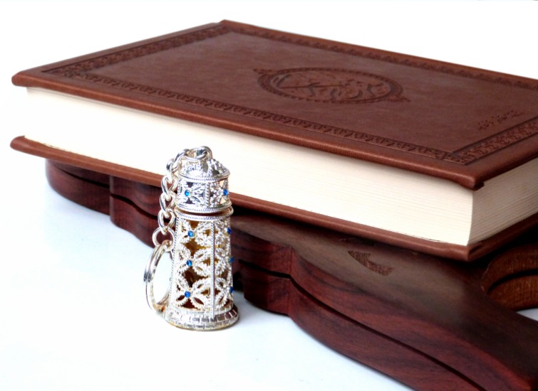 Pack Cadeau Marron : Le Saint Coran version arabe marron, Porte Coran en Bois et un Le Parfum Musc d'Or Porte clé Musc Blanc - REF. 24159 (36.00 €)