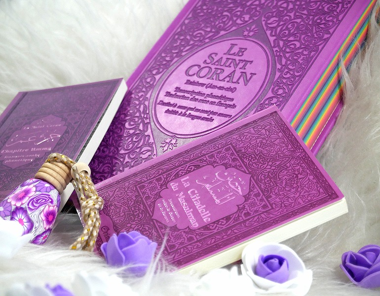 Pack Cadeau pour femme musulmane couleur mauve assorti avec : Le Saint Coran Rainbow - Chapitre Amma - La Citadelle du Musulman - Diffuseur de parfum Deco & Cadeau Coup de coeur