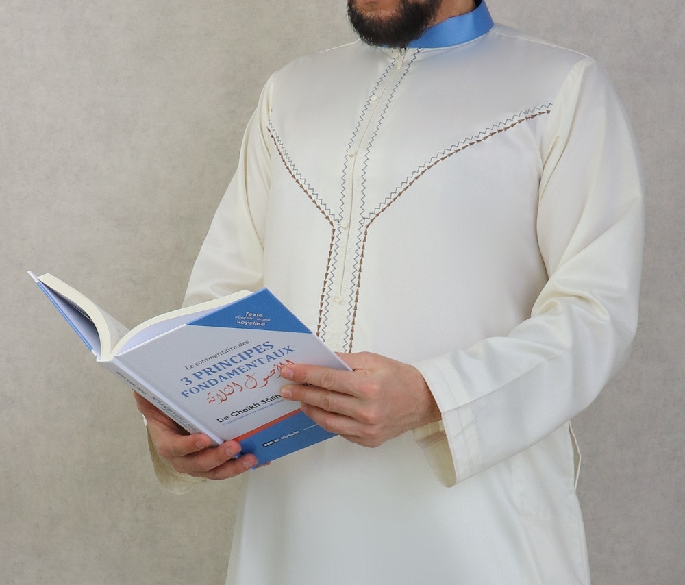 Qamis long, manches longues, ouverture zip cachée au niveau de la poitrine. Décoration sous forme de faux boutons. Col de couleur bleu. Tissu fluide et très agréable de qualité supérieure, légèrement satiné, toutes saisons.
