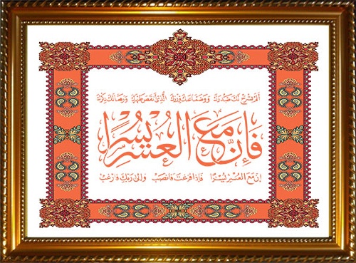 أَلَمْ نَشْرَحْ لَكَ صَدْرَكَ (1) وَوَضَعْنَا عَنكَ وِزْرَكَ (2)الَّذِي أَنقَضَ ظَهْرَكَ (3) وَرَفَعْنَا لَكَ ذِكْرَكَ (4) فَإِنَّ مَعَ الْعُسْرِ يُسْرًا (5) إِنَّ مَعَ الْعُسْرِ يُسْرًا (6) فَإِذَا فَرَغْتَ فَانصَبْ (7) وَإِلَىٰ رَبِّكَ فَارْغَب (8)