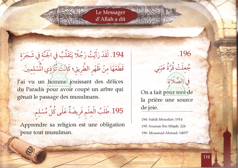 Chacun de nous sait que la religion repose musulmane repose sur deux fondements : Le Livre d’Allah et la Sunnah de Son Messager (PSDL). Notre noble Messager a dit : « Transmettez de ma part ne serait-ce qu’un verset ou un hadith. » Et il a dit : « Quiconque m’attribue délibérément ce que j’ai pas dit a mérité sa place en Enfer. »Par ces deux hadiths, chaque croyant se voit charger chacun selon ces capacités et la science religieuse dont il dispose de transmettre les hadiths du Messager d’Allah (PSDL).En outre, il doit obligatoirement s’assurer que les paroles du Prophètes (PSDL) qu’il transmet aux autres, musulmans ou non sont authentiques.Le but de la publication de cet ouvrage est de transmettre les paroles du Messager (PSDL) aux hommes et femmes et en particulier aux plus jeunes d’entre eux et ce, aux quatre coins de la terre. Cet ouvrage contient 200 hadiths, voici quelques titres :