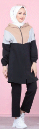 Ensemble décontracté tricolore à capuche pour femme musulmane (Survêtement Hijab Sport - Grande taille disponible) - Couleur noir, beige et gris - REF. 32738 (29.90 €) - En Promotion à 21.90 €